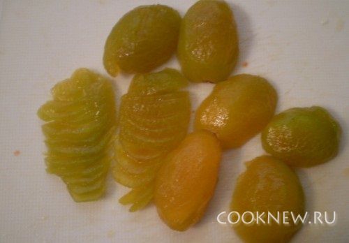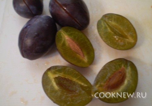 Сливы обдать кипятком, снять кожицу, разделить на половинки.