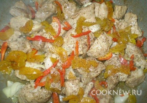 Добавить к мясу сливы,перец, лук. Посолить, поперчить по вкусу. Обжарить все вместе пару минут.