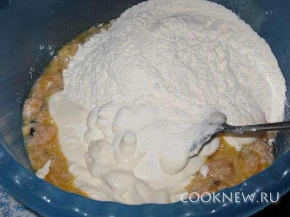 Всыпать муку и пакетик разрыхлителя.