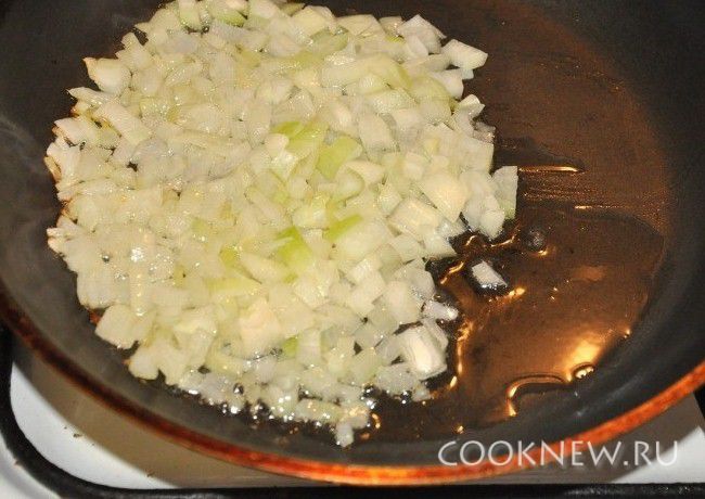 Отварит куриную грудку. Пока она варится займемся подготовкой других ингредиентов. Лук очистить, измельчить и обжарить на масле.