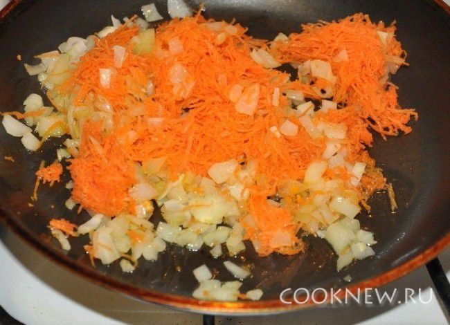 Морковь почистить,потереть на мелкой терке. Добавить к луку и обжарить 10 минут.