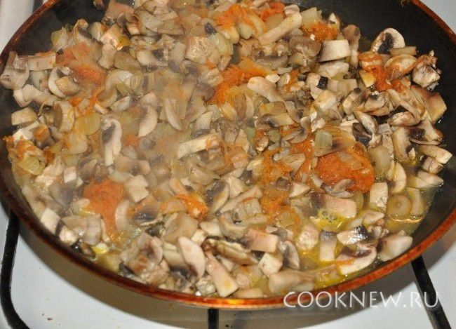 Затем добавить грибы и обжаривать пока не испарится жидкость.