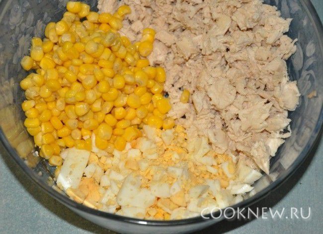 Начинку остудить, нарезать курицу мелко,смешать, добавить яйца и кукурузу.