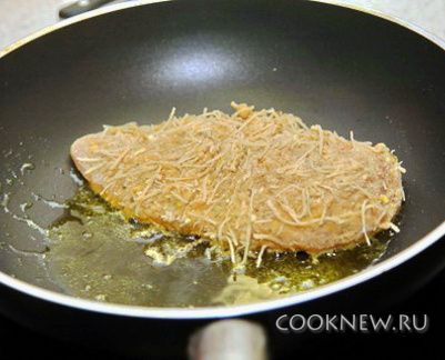 Яйцо слегка сбиваем вилкой. Обмакиваем в нем курицу и затем панируем в смеси сухарей.