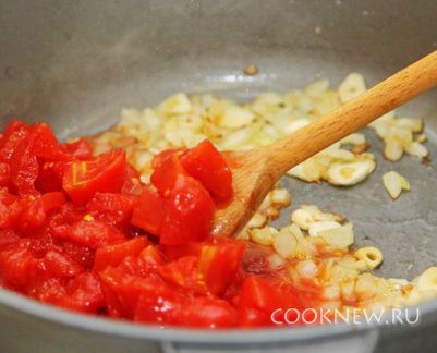 Добавляем томаты в собственном соку, предварительно очистив от кожицы. Тушим несколько минут.