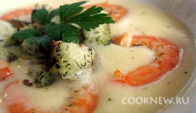 В тарелку налить суп, положить креветки, приправить красным перцем по вкусу и веточкой петрушки.