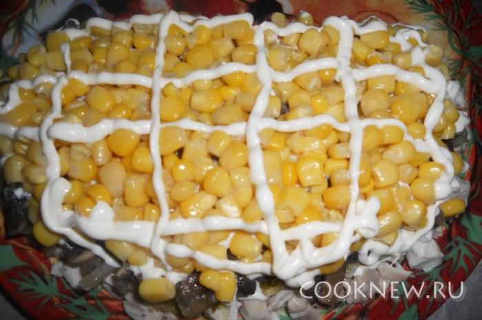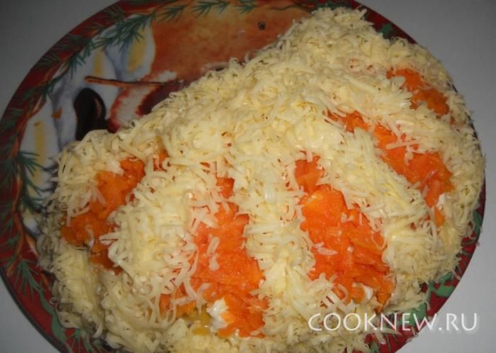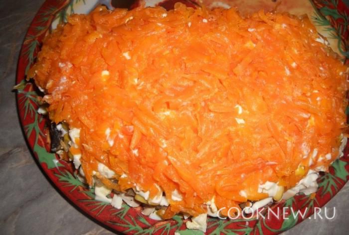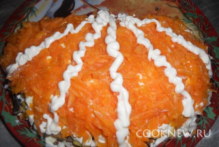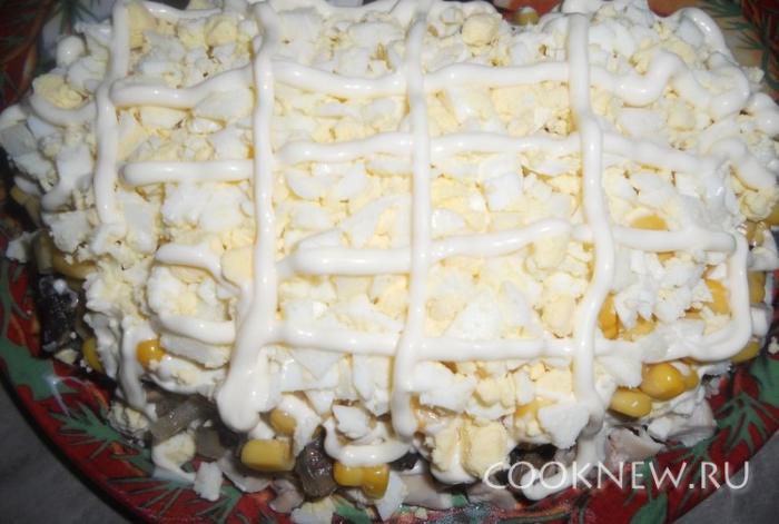 Мелко нарезать яйца, выложить на салат и сделать сетку.
