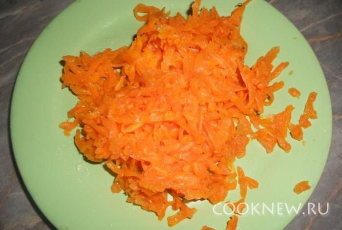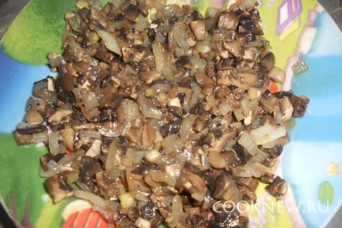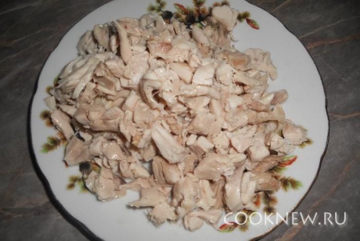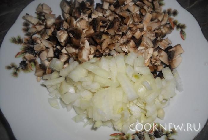 Отварить отдельно курицу, яйца и морковь Тем временем мелко порезать лук и грибы.