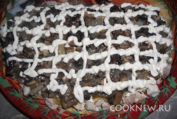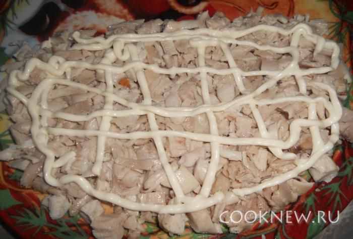 Выложить курицу на блюдо, сделать сетку из майонеза.