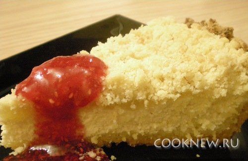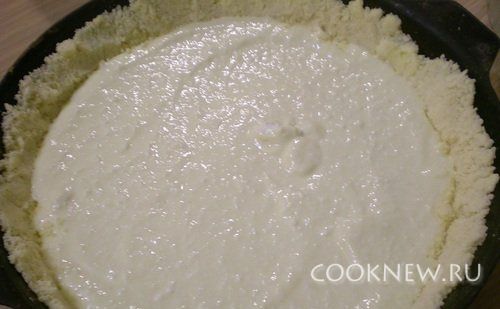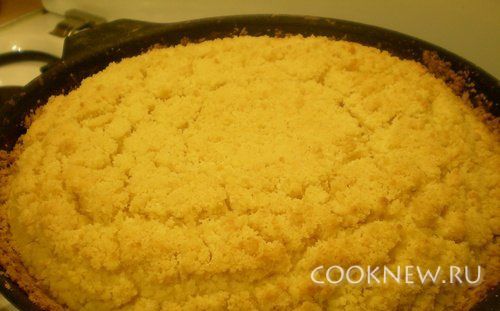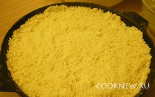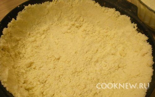 Половину крошки выложить в форму, стараясь сформировать небольшие бортики.