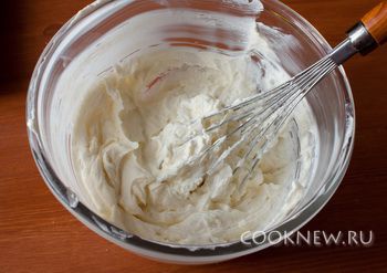 Ставим в духовку (160) и выпекаем 10 минут. Тем временем готовим начинку - сыр взбиваем с сахаром веничком до однородной консистенции.