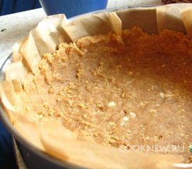 Форму застелить бумагой, смажьте маслом. Выложить основу, делая небольшие бортики. Поставить в холодильник на 30 минут. Желатин замочить в сливках.
