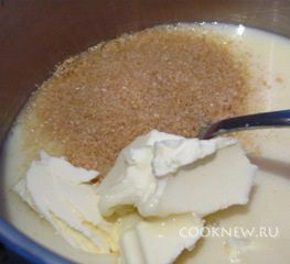 Поставить кастрюлю на небольшой огонь, соединить сгущенку, масло (40 гр) и сахар (45 гр).