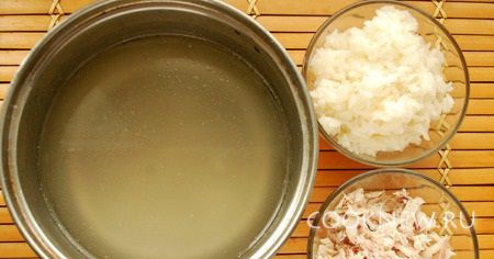 Отварить курицу. Бульон процедить, курицу разобрать на волокна. Рис отварить как обычно.