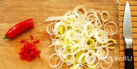 Лук порей порезать кружочками(белую часть). Перец Чили почистить от семян, мелко нарезать.