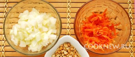 Репчатый лук очистить и порезать, морковь натереть на крупной терке, кешью порубить.