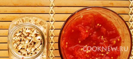 Сушеный сельдерей замочить в столовой ложке теплой воды. Помидоры очистить и порезать. Сок тоже собрать.