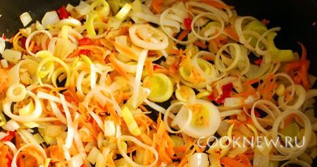 Добавить лук порей. морковь, Чили и сельдерей. Тушить 3-4 минуты.