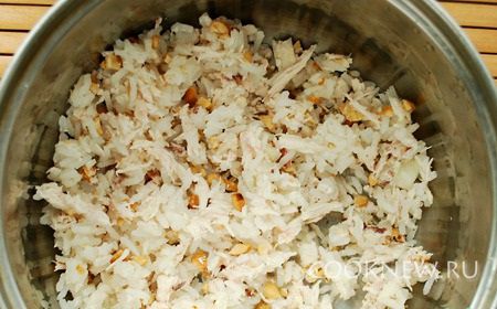 Смешать рис, курицу и орехи.