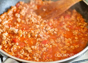 Помидоры и помидоры в собственном соку очистить от кожицы, смолоть в блендере с добавлением томатной пасты. Фарш посолить, поперчить по вкусу, добавить массу из помидор. Дать покипеть до загустения.
