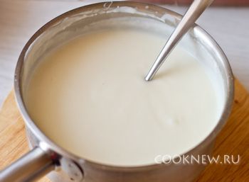 Вливаем медленно молоко, постоянно помешиваем, чтобы не было комков. Добавить мускатный орех и варить до загустения.