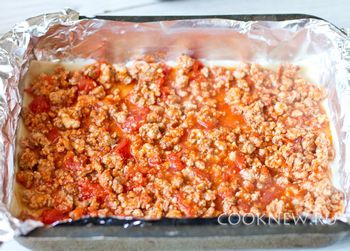 Сборка лазаньи: на дно формы наливаем немного соуса, сверху кладем листы лазаньи и поверх них распределяем треть фарша.