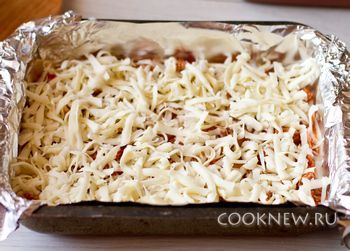 Посыпаем тертым сыром. Повторяем слои дважды.