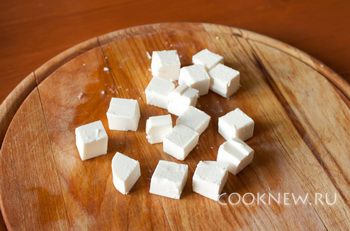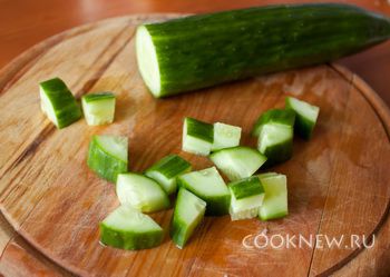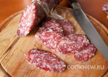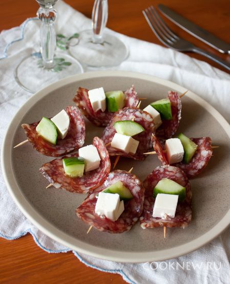 С одного края накалываем салями, затем сыр и огурец и втыкаем зубочистку в противоположный конец колбасы.