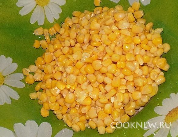 С кукурузы сливаем жидкость, высыпаем в салатницу.