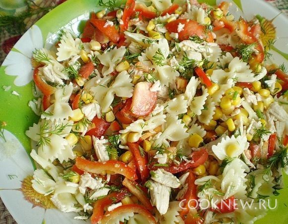 Добавляем остывшие макароны, добавляем чеснок, выдавленный через чеснокодавилку.
