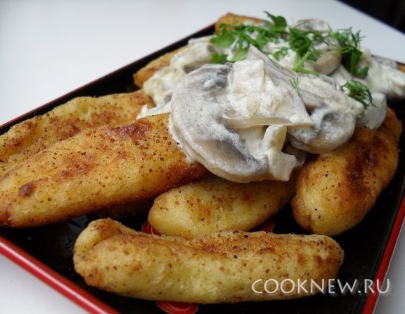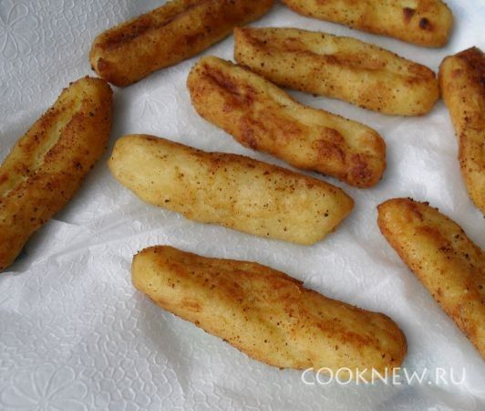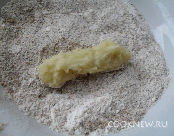 Из массы сформировать палочки и обвалять в смеси панировачных сухарей и муки.
