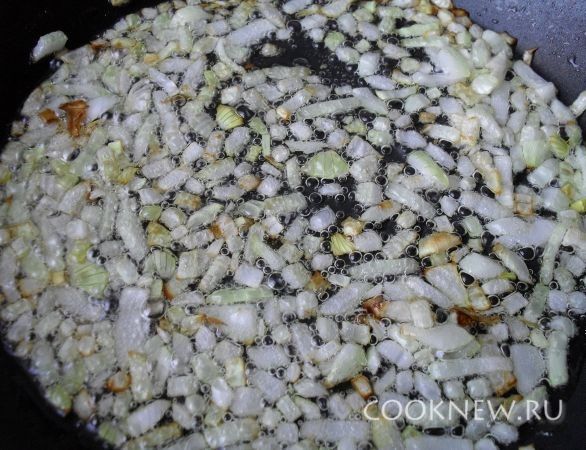 Поставить варится картофель. Пока он варится почистить, мелко порезать 1 головку лука и обжарить на масле.