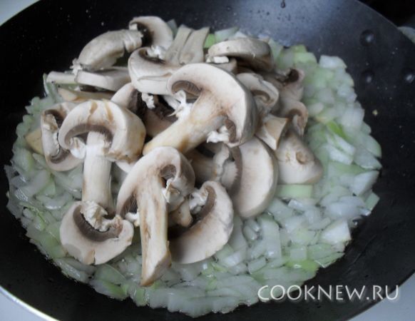 В другой сковороде пожарить вторую луковицу вместе с грибами.