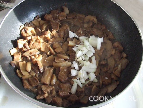 Растопить сливочное масло, обжарить на нем грибы, добавить порезанный лук и в конце тушения добавить сметану.