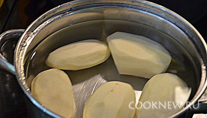 Отварить картофель в подсоленный воде и сделать из него пюре.
