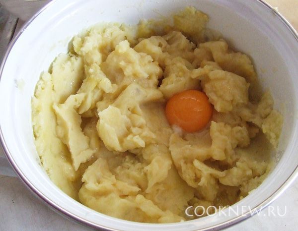 К пюре добавить 1 яйцо и 1 белок, перемешать. Добавить муку. Перемешать.