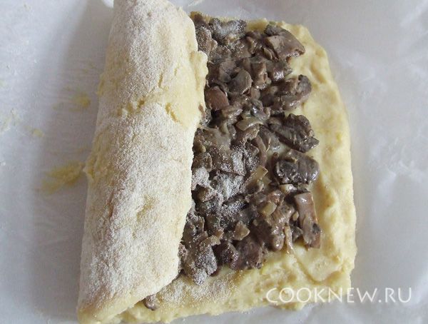 Лист бумаги посыпать манкой, выложить прямоугольник из картофеля. В центр положить начинку, распределить но оставить см 3 до всех сторон. чтобы при сворачивании она не вылезла.