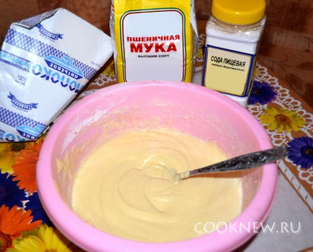 Яйца растереть с полстаканом сахара и маслом. Соду погасить уксусом, добавить к смеси, добавить мед. Всыпать муку, перемешать. Добавить молоко и все хорошо перемешать.