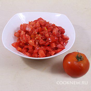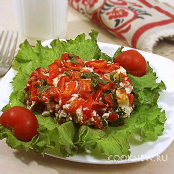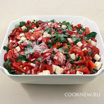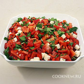 Форму для запекания смазать маслом. Добавить перец,помидоры, брынзу,петрушку. Перемешать.