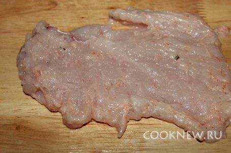 Курицу накрыть полиэтиленом и отбить. Посолить,поперчить по вкусу.