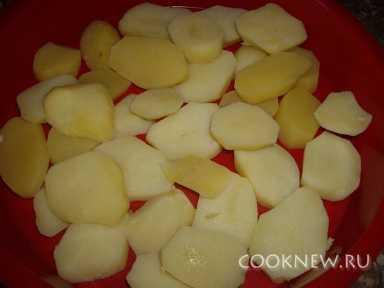 Картофель почистить, отварить, порезать кружочками и выложить на дно формы для запекания.