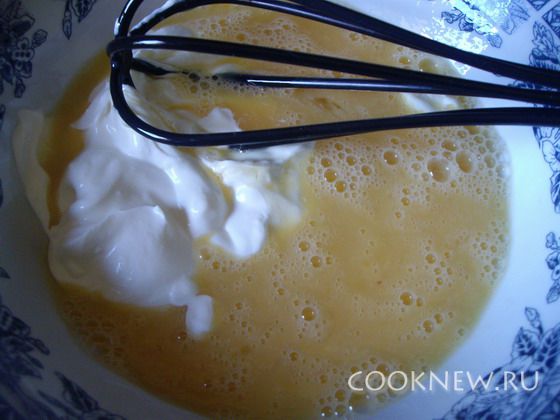 В миске взбить яйца до появления пены, добавить сметану, перемешать.