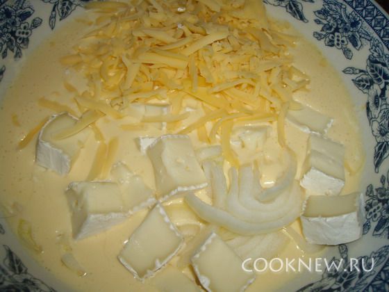Сюда же добавить лук, порезанный полукольцами, сыр сливочный, порезанный кубиками и твердый сыр, натертый на крупной терке. Все перемешиваем.