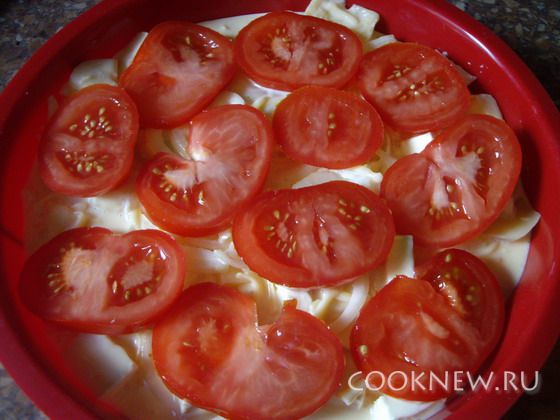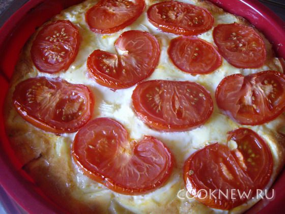 Смесью заливаем картофель, сверху выкладываем кружки помидор.