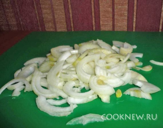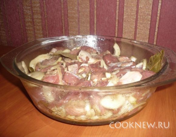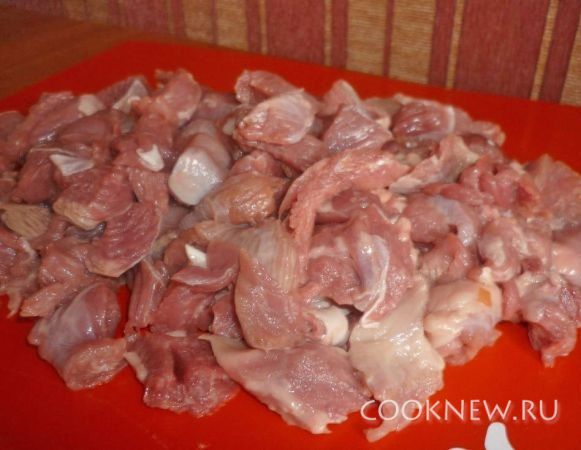 Мясо порезать на кусочки (можно заменить на нежирную свинину).