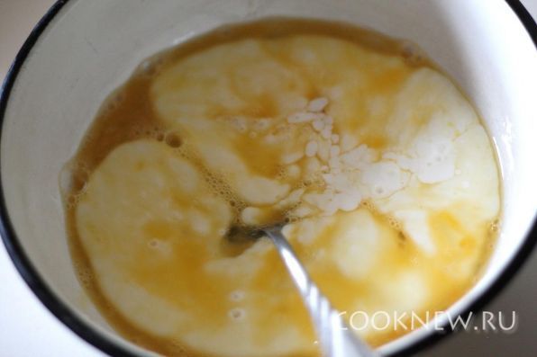 Делаем жидкое тесто: яйцо взбить с солю. добавить кефир.