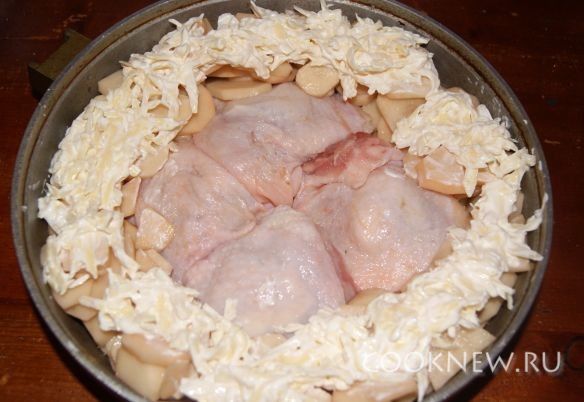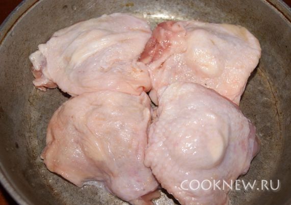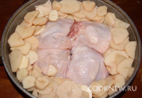 Форму смазываем маслом. Бедра моем, солим и начиняем рубленным чесноком. Укладываем в середину формы.