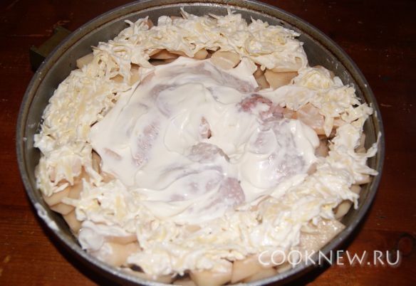 Смазываем майонезом курицу. Разогреваем духовку до 200 и выпекаем наше блюдо 40 минут.