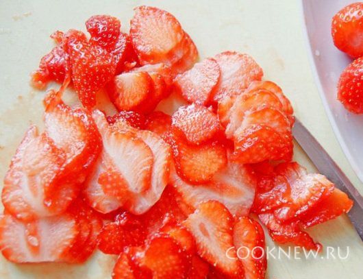 Клубнику порезать тонкими ломтиками.