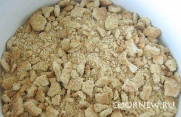 Заварить крепкий кофе. Печенье покрошить мелко, полить все 6 столовыми ложками кофе.